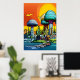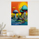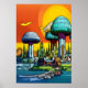 A colourful mushroom village, where all the houses is in the shape of mushrooms, orange and yellow sky in the background. This is a AI generated art.