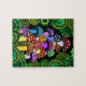 A jigsaw puzzle with colourful psychedelic mushrooms surrounded by green paisley and green mandalas.