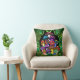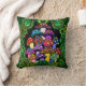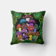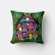 A pillow with colourful psychedelic mushrooms surrounded by green paisley and green mandalas.