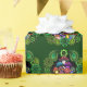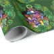 A roll of wrapping paper with colourful psychedelic mushrooms surrounded by green paisley and green mandalas.