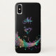 Colourful Music Notes n Clef Heart Personalised iPhone X Case. A black phone case with a pastel rainbow coloured treble bass clef heart and a gold staff with matching pastel rainbow musical notes. Fill in your name and initial at the prompt to personalise and customise any way you like. A great gift for your favourite musician or music lover.