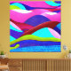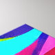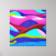 Colourful abstract landscape of hills and an ocean in colours of pink, purple, blue, green, and cyan.