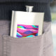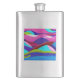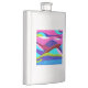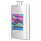 Colourful abstract landscape of hills and an ocean in colours of pink, purple, blue, green, and cyan.