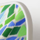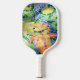 This bright cheerful multi colour Pickleball paddle features a koi pond made of colourful mosaic tiles dappled in sunlight and shadow. An orange koi fish swims though the green lily pads and blue water. This is one of multiple coordinating fun and beautiful paddles of a Zen design.