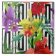 Gorgeous floral design to brighten up your life. Watercolor Orchid flowers in purple, coral, red and yellow with a background of geometric black and white pattern.