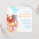 Colourful orchid wedding invitation with turquoise blue and orange text.