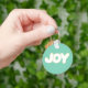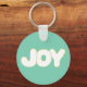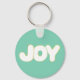 Enjoy the word Joy written in blue, green, and orange printed on keychains.