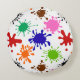 White background with black, blue, red, green, orange and brown paint splatters pattern.