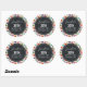 Birthday sticker with a cute pattern of macarons in many different colours with a faint polka dot pattern behind. Personalised text written in white on a black circle.