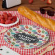 Personalised birthday plates with a cute pattern of macarons in many different colours with a faint polka dot pattern behind.