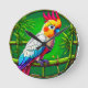 Colourful parrot perched on a bamboo branch, set against a vibrant green background. The parrot has a striking plumage with a mix of white, orange, pink, and blue feathers. Its head showcases a bright orange crest, along with a playful expression highlighted by big, round eyes. Surrounding the parrot are several bamboo leaves, contributing to an exotic tropical atmosphere. The design has a bold, graphic style, making the parrot appear almost cartoonish and lively.