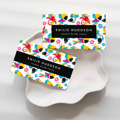 Cute, fun and adorable business cards with colourful parrots and flowers. Modern and trendy design, perfect for pet shops and bird stores.