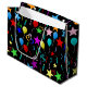 Colourful party balloons and stars on black background pattern design.