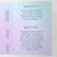 Modern trifold brochure featuring a colourful holographic gradient in pastel pink, purple, blue and green. The front has your name in an elegant handwritten signature font along with your job title. The back panel has your hours of operation and contact information. The inner fold panel has two headers and text boxes. The inside has multiple templates for information about your business on the outer panels and a price list in the middle panel. These pretty and feminine trifold brochures are great for a nail salon, beauty salon, hair stylist, or makeup artist.