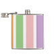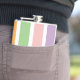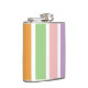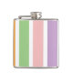 Geometric linear, rectangle, striped pattern of rainbow pastel hues of blue, orange, green, pink, purple, red and yellow.