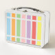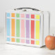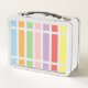 Geometric linear, rectangle, striped pattern of rainbow pastel hues of blue, orange, green, pink, purple, red and yellow.