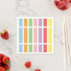 Geometric linear, rectangle, striped pattern of rainbow pastel hues of blue, orange, green, pink, purple, red and yellow.