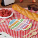 Geometric linear, rectangle, striped pattern of rainbow pastel hues of blue, orange, green, pink, purple, red and yellow.
