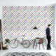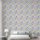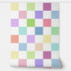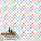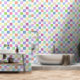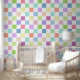 This wallpaper features a chequered or chequerboard pattern in soft pastels of pink, green, blue, peach, orange and lavender with white.