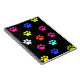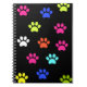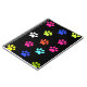 This design features multi-colour paw prints in white, purple, green, pink, blue, yellow and orange on a black background.