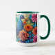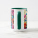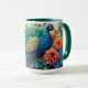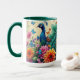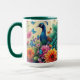 This coffee mug has two peacocks surrounded by flowers. It's all colourful.