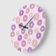 This unique doughnut illustration clock features hand drawn illustrations of pink, white, and purple doughnuts on a pink pastel striped background. It would be cute for a baby's nursery or a girl's bedroom. It would also work in a kitchen or for a bakery.