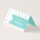 Whimsical bakery folded business card done in white with colourful pastel polka dot pattern and a aqua ribbon text area, on the front. The inside is done in a solid aqua with fun graphics of a white chalk drawing look of a wedding cake. Personalise the text to suit your business needs.
