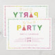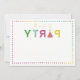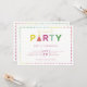 “It’s time to” in faux gold foil, followed by party in colourful letters. Matching colour polka dots around the edges.
