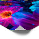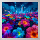 A vibrant cyberpunk garden where luminous flowers stretch toward a futuristic misty skyline—a surreal urban nature art print of dazzling color contrast