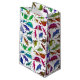 Original fine art design of little Pre-Historic dinosaurs including Tyrannosaurus Rex, Brachiosaurus, Stegosaurus, Hypsilophodon and Triceratops in a rainbow of colours on a quality gift bag for dinosaur fans from children to adults.