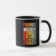 Hockey coach mug with hockey puck and sticks with colourful stripes and text that reads Proud Hockey Coach.