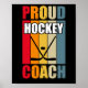 Hockey coach poster with hockey puck and sticks with colourful stripes and text that reads Proud Hockey Coach.