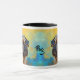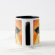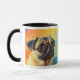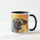 This bright and colourful mug celebrates the adorable Pug dog! Two sides of the mug have a beautiful portrait of a little Pug against a brightly splashed background. Predominant colours include orange, gold, yellow and blue. At the centre is script that says Pug, but you may change it or even personalise it, if you wish. This mug will get noticed!