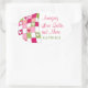Colourful custom quilting business stickers done in green, pink, and white. Graphics of a quilt with hearts decorates the left side of the sticker, with pink and green custom text ready to personalise for your business. Matching products are available.