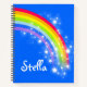 Bright and colourful rainbow with stars on a sky blue background notebook. Personalise with your own name currently reads Stella. Other matching items are available. Original rainbow graphic art and design by Sarah Trett for www.mylittleeden.com