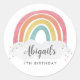 Colourful Rainbow Calligraphy Kids Birthday round sticker feature a hand drawn rainbow in shades of pink, orange, yellow and turquoise and a trendy calligraphy name.