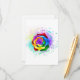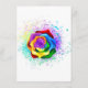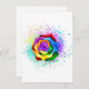 Large, blooming rose with rainbow petals on white background, painted over with splashes of colourful, bright paint. 3d