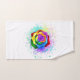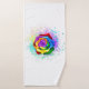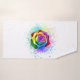 Large, blooming rose with rainbow petals on white background, painted over with splashes of colourful, bright paint. 3d