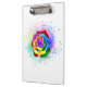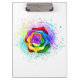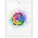 Large, blooming rose with rainbow petals on white background, painted over with splashes of colourful, bright paint. 3d