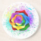 Large, blooming rose with rainbow petals on white background, painted over with splashes of colourful, bright paint. 3d