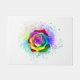 Large, blooming rose with rainbow petals on white background, painted over with splashes of colourful, bright paint. 3d