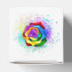 Large, blooming rose with rainbow petals on white background, painted over with splashes of colourful, bright paint. 3d