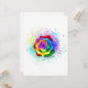 Large, blooming rose with rainbow petals on white background, painted over with splashes of colourful, bright paint. 3d