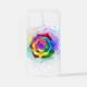 Large, blooming rose with rainbow petals on white background, painted over with splashes of colourful, bright paint. 3d