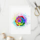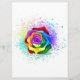 Large, blooming rose with rainbow petals on white background, painted over with splashes of colourful, bright paint. 3d