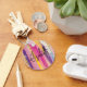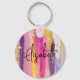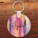 A key chain with an abstract background design. Vibrant stripes in both bold and pastel colours. Pinks, blues, purples and yellow colours combined with faux gold sparkly glitter layered over top.