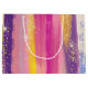 A gift bag with an abstract background design. Vibrant stripes in both bold and pastel colours. Pinks, blues, purples and yellow colours combined with faux gold sparkly glitter layered over top.