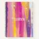 A personalised spiral notebook with an abstract background design. Vibrant stripes in both bold and pastel colours. Pinks, blues, purples and yellow colours combined with faux gold sparkly glitter layered over top.