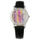 A watch with an abstract background design. Vibrant stripes in both bold and pastel colours. Pinks, blues, purples and yellow colours combined with faux gold sparkly glitter layered over top.