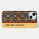 This stunning iPhone and Samsung cell phone design features a vivid and sunny gold, red, and blue coloured tribal pattern of circles and other geometric shapes with a swash of gold and your name or initials in bold typography along the right side. The warm colours have a contemporary, distinct look to personalise your phone. Make sure to type your name and replace the placeholder text when ordering.